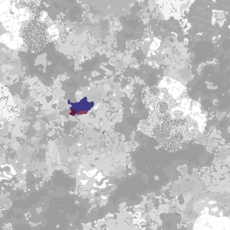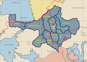 Map of claimable areas showing the former territory of Cauldra in light blue, with contested territories (dark red being disputed land with Aranna, light red being the condominium between Cauldra and the Tsagaan Khanate, and light blue/dark blue being disputed land with Ashannar)